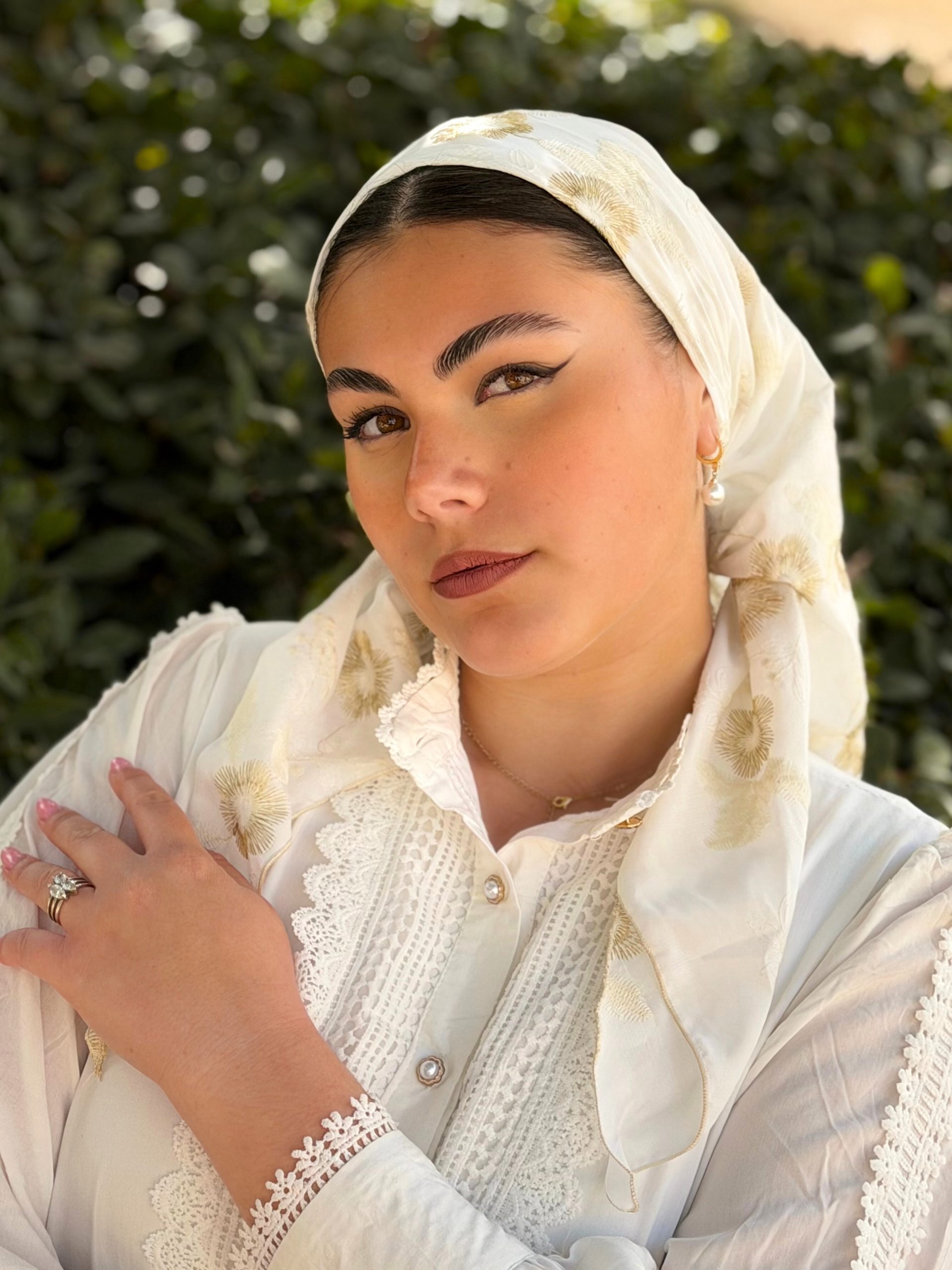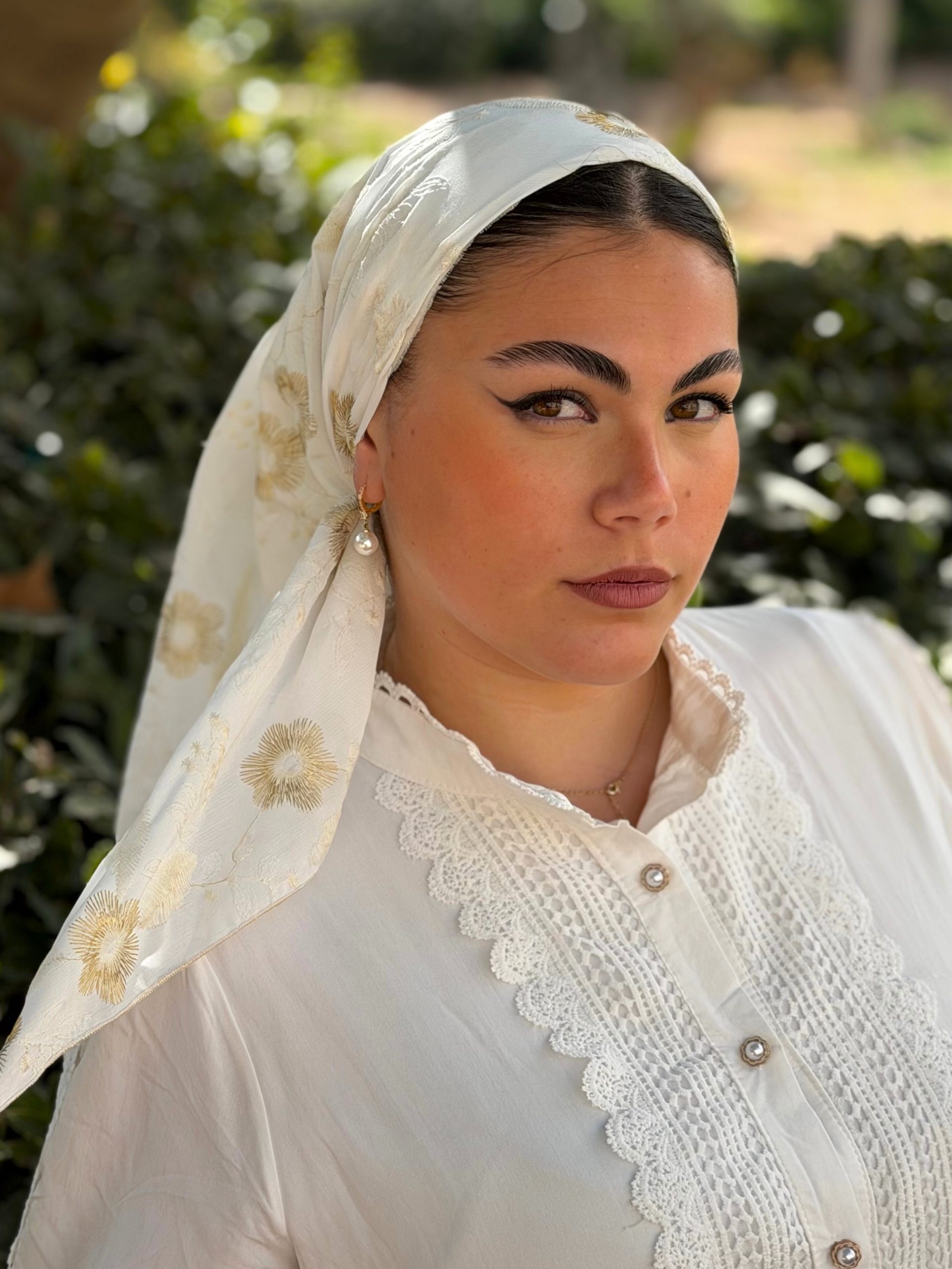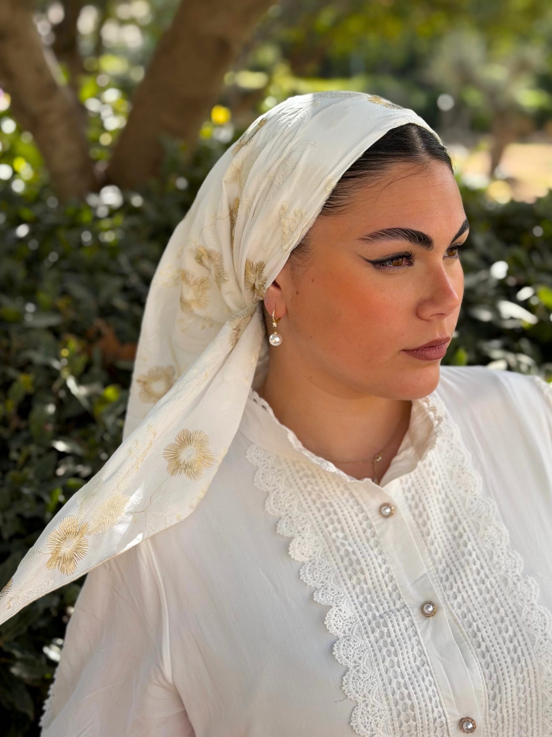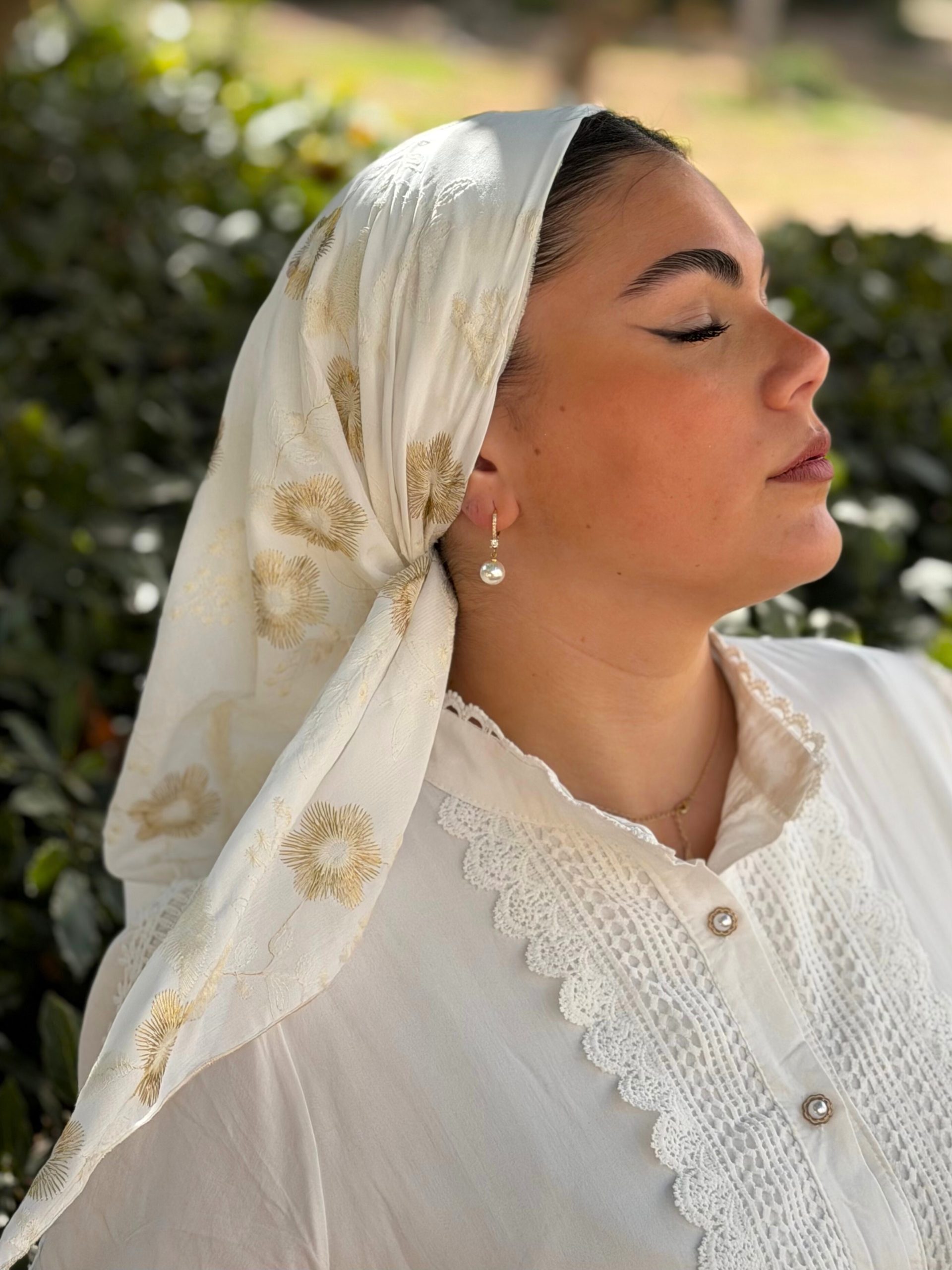 Our triangular scarf allows for a very simple and versatile tying: on the side, on the back, or in the style of a turban on the top of the head.
