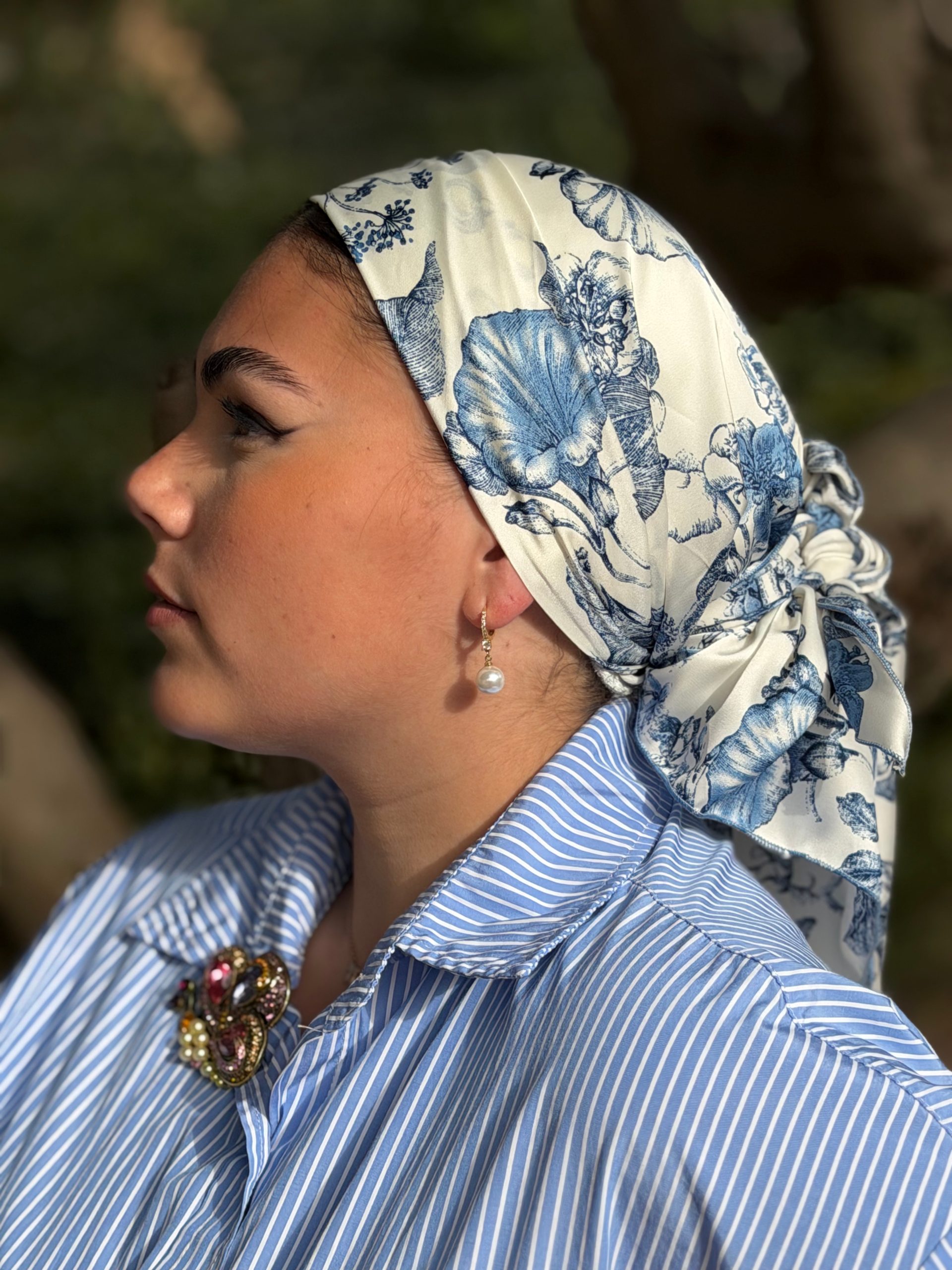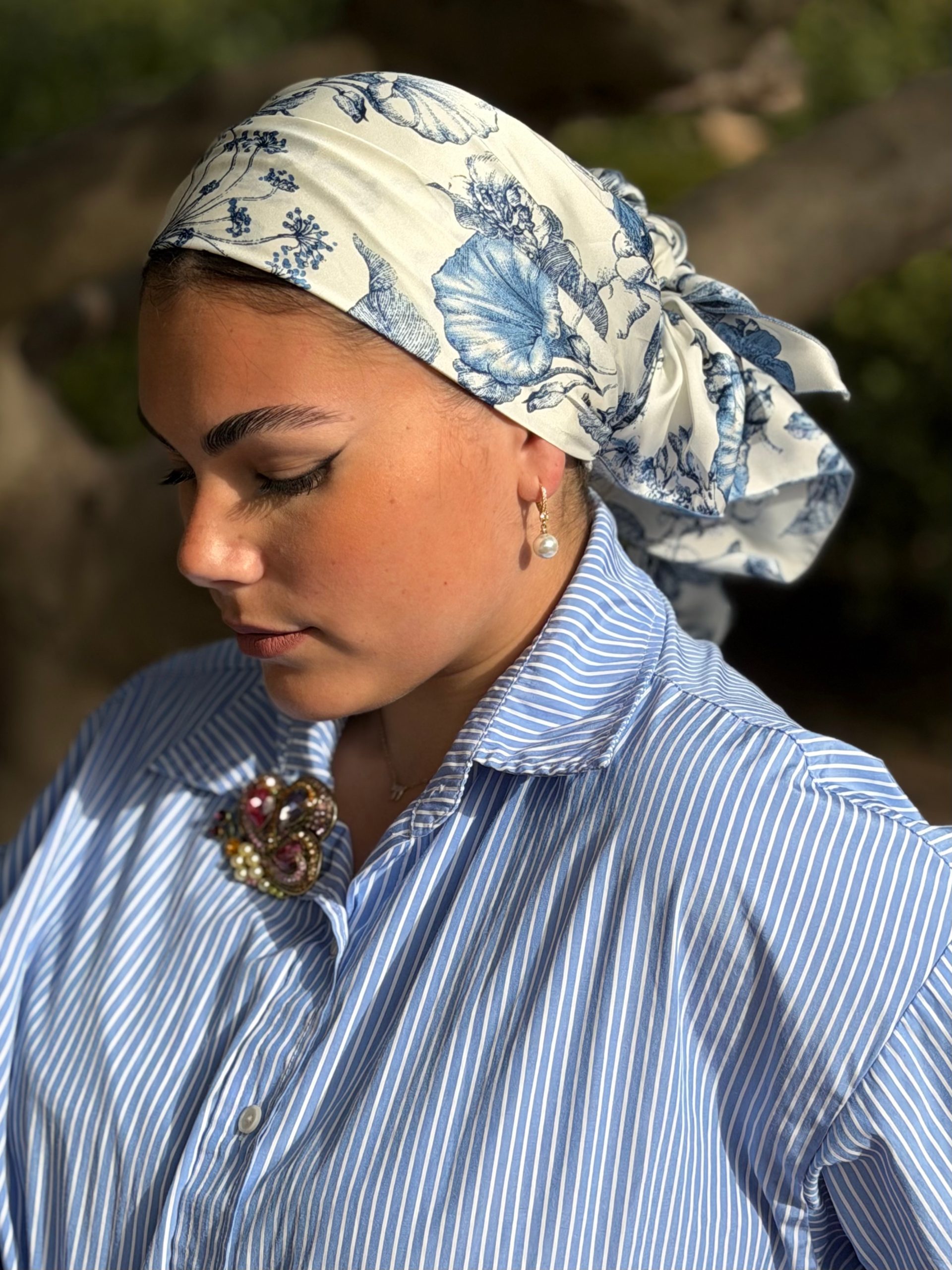 Our triangular scarf allows for a very simple and versatile tying: on the side, on the back, or in the style of a turban on the top of the head.