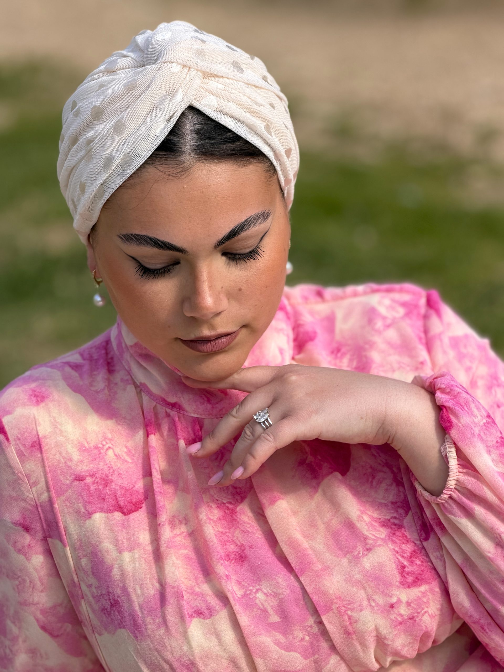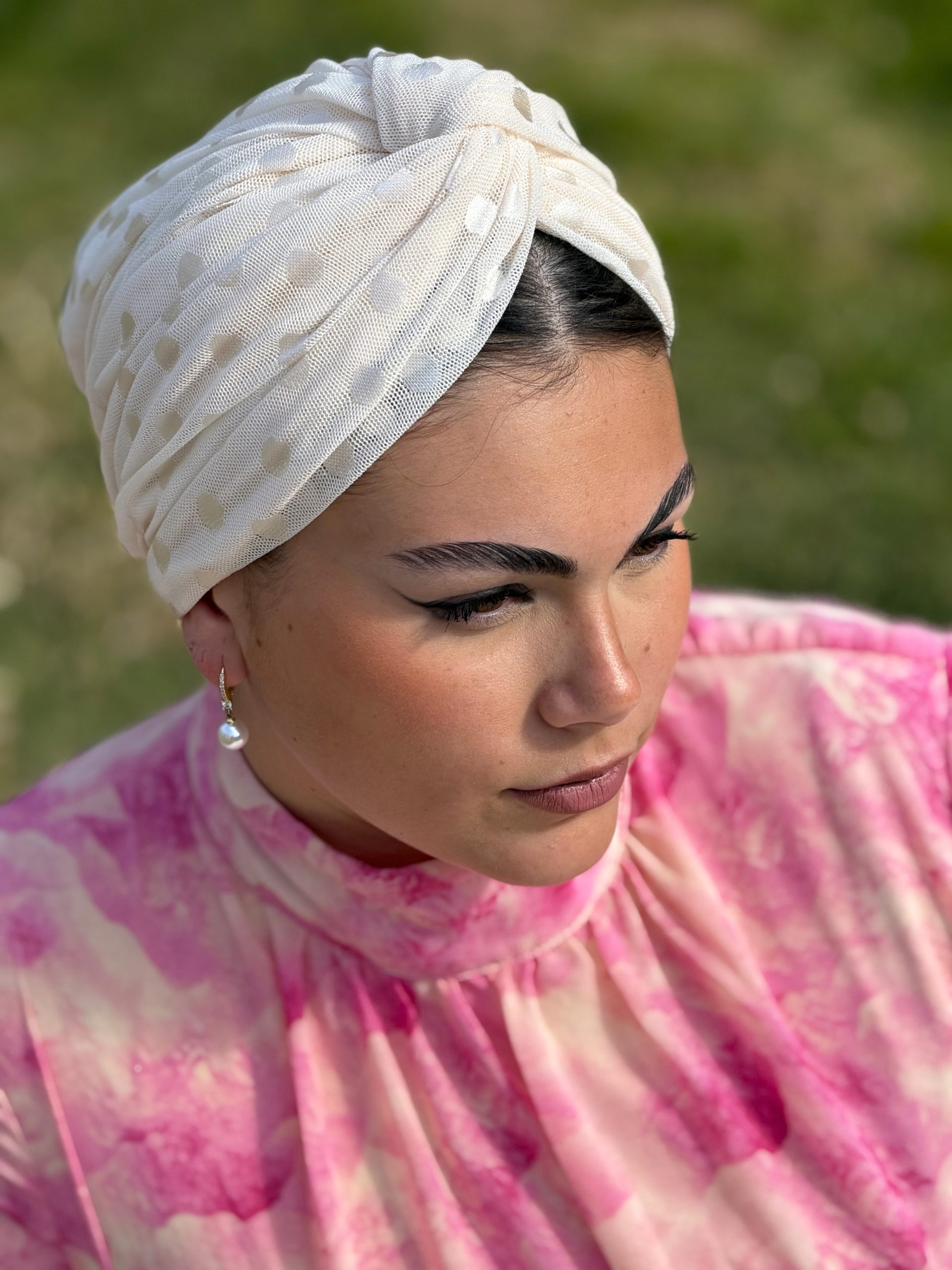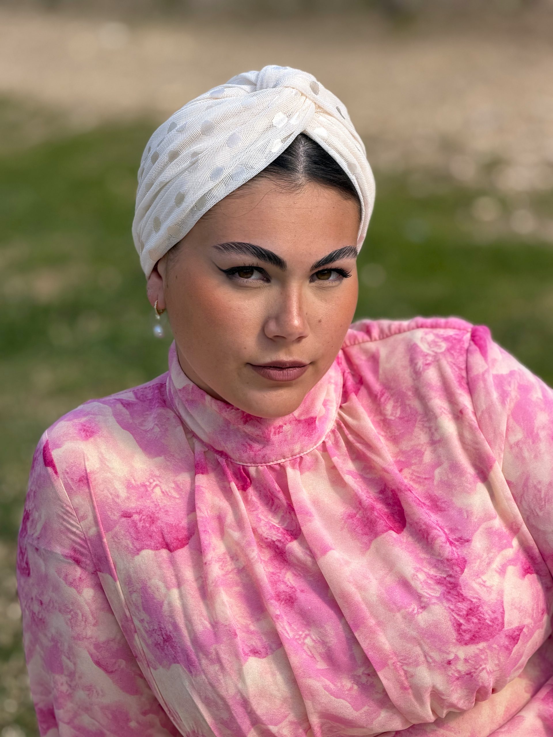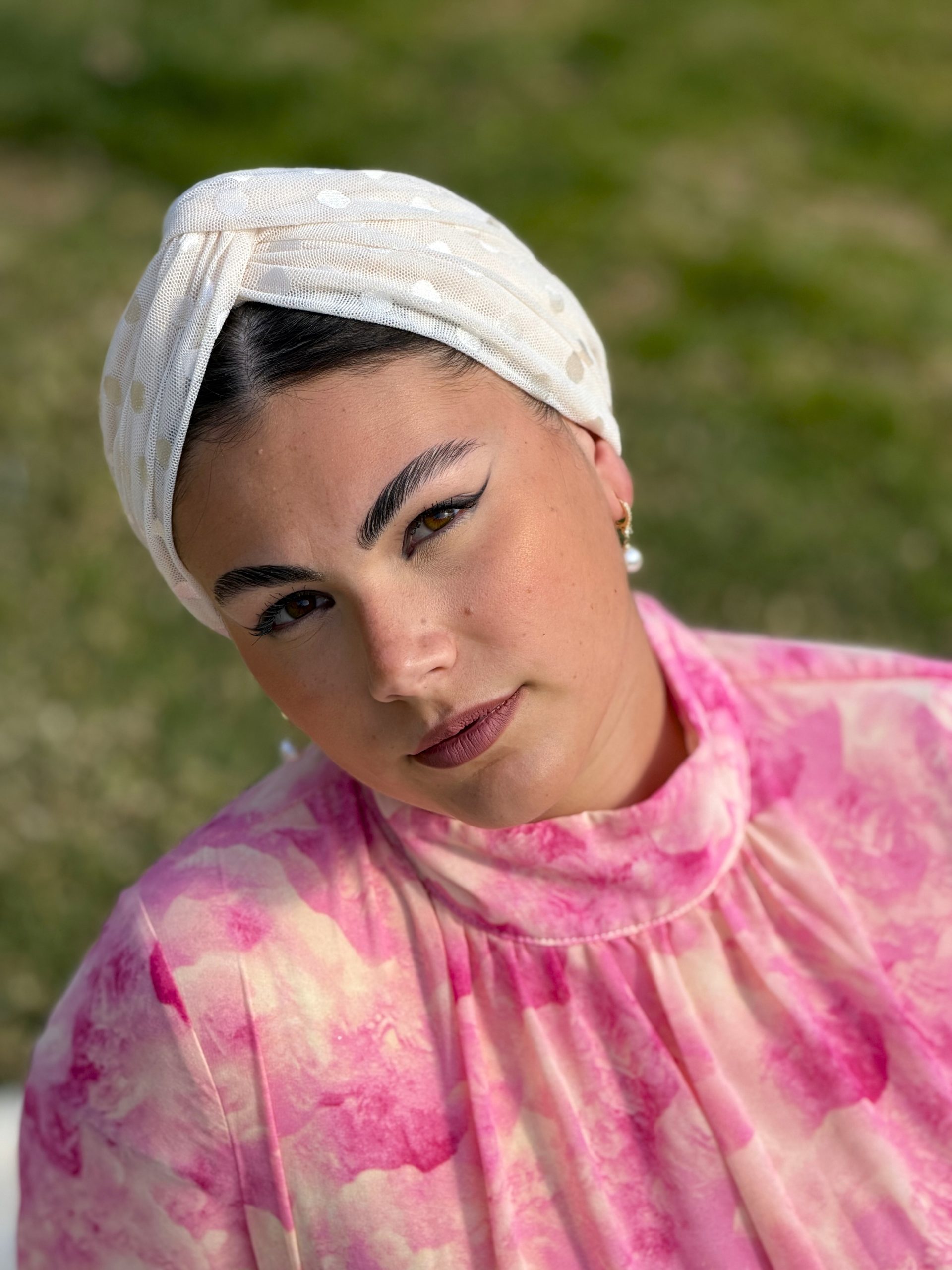 Our triangular scarf allows for a very simple and versatile tying: on the side, on the back, or in the style of a turban on the top of the head.